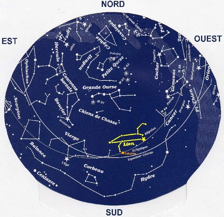 Des le mois d’avril on peut voir le lion qui se forne d’une grand trapeze et d’un point d’interrogation a l’envers. Son etoile la plus brillant est regulus en bas a droite du trapeze. On peut trouver le lion en prolongeant la derniere etoile du manche de la grande ourse.